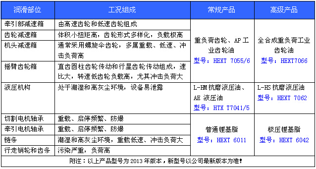 煤炭行業采煤機設備潤滑系統,是指使用有油液潤滑的減速傳動齒輪潤滑系統,如截割部、搖臂、牽引傳動部等,還有部分液壓系統及軸承和其他部件,產品包含齒輪油、液壓油、鋰基脂等以下為“合軒化工”在煤炭行業中采煤機用油案例推薦表: