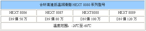 合軒HEXT 8060高速低溫潤滑脂分為多款產品,滿足溫度在-20℃至-60℃低溫范圍內潤滑防凍需求,DN值有50萬、80萬、100萬、120萬等,高效解決軸承高轉速甩落,飛濺難題,多面體多元化,集合潤滑、防銹、防腐、防凍、抗磨等多種性能,質量優、效果保證,值得選購哦!